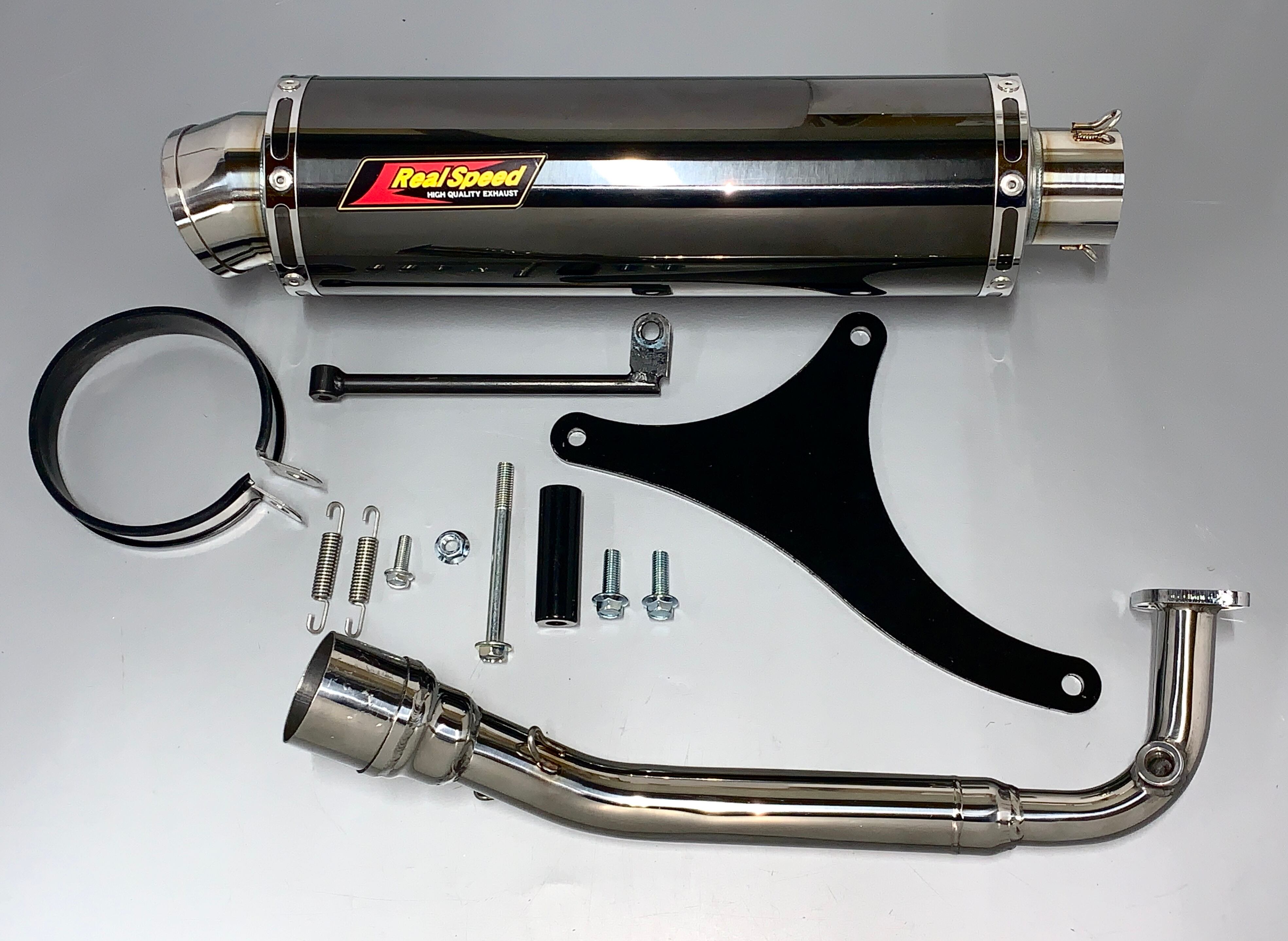 こちらのマフラーを取り付けるのに必要なボルト、バンド等も同梱されています。 消音バッフルも付いていますので2種類の音の変化を楽しめます。