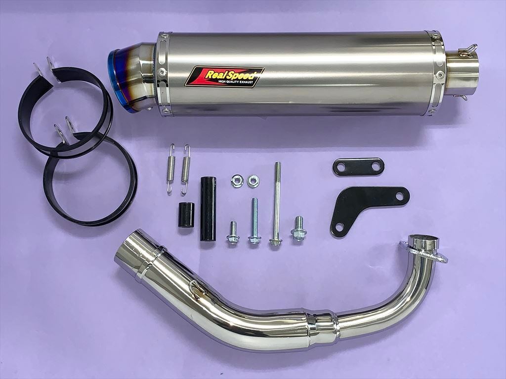 チタンパイプを使用した軽量なサイレンサーのマフラーです。 サイレンサー出口部分にブルーのワンポイントがあり、 サイレンサー筒部分にはソリッドのチタンを使用しているので全体的に派手にならず